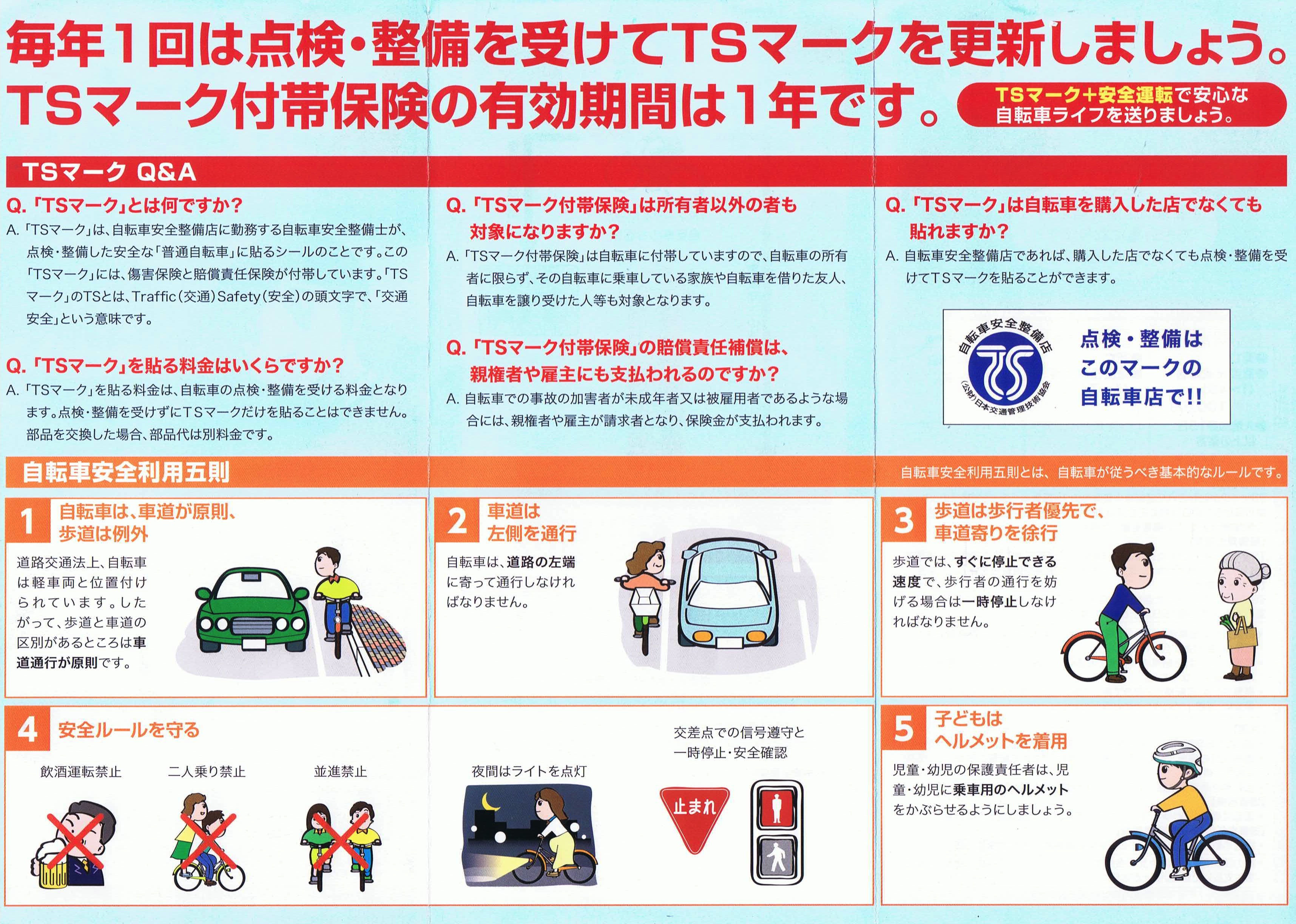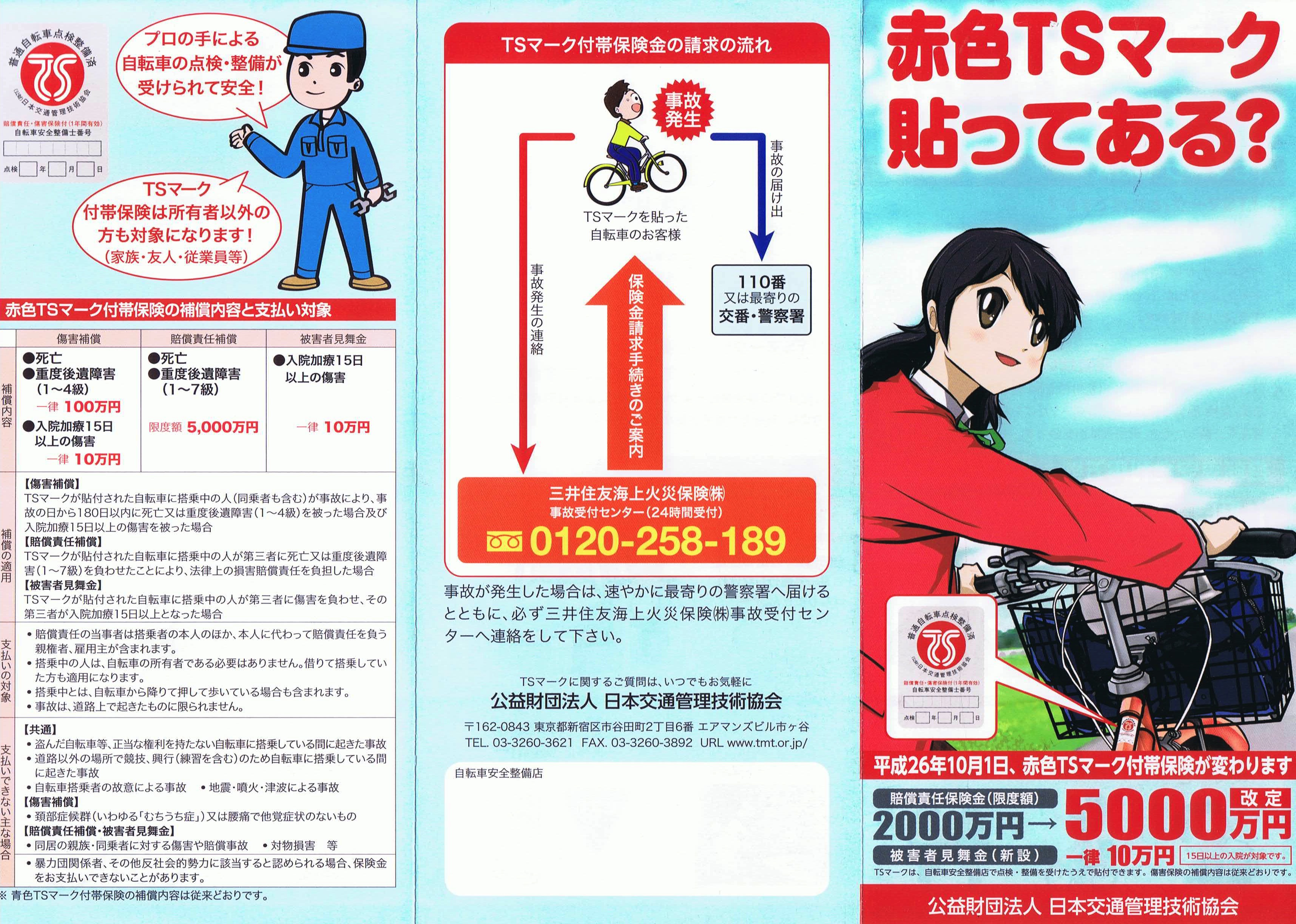 TSマークは自転車自体に保険が付くので、自転車の所有者だけに限らず、その自転車に乗車している家族や友人等も対象となります。