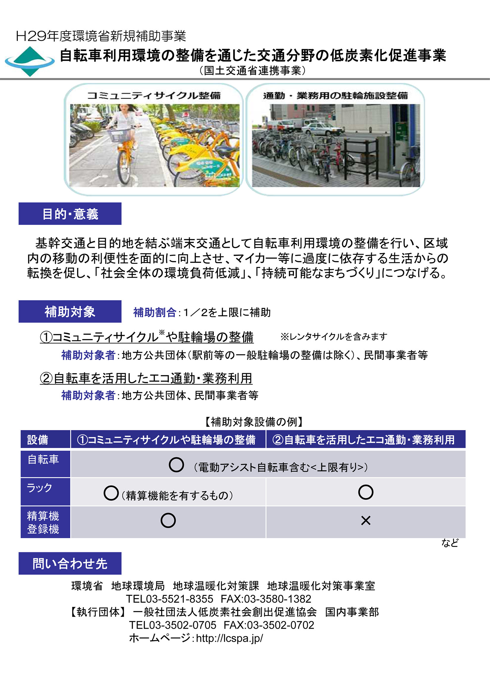 H29年度環境省新規補助事業「自転車利用環境の整備を通じた交通分野の低炭素化促進事業」の募集について