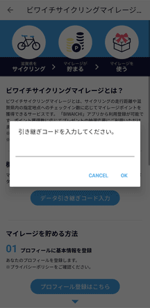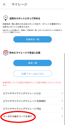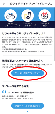 メニュー画面からマイレージを選択し、右図の画面まで行ったら「データ引き継ぎコード入力」を押します。