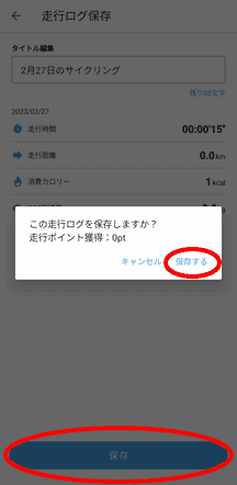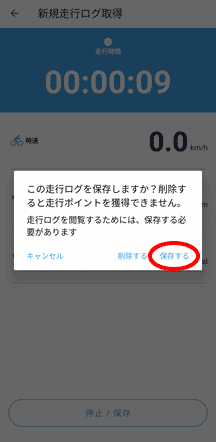 サイクリングを終了したら「停止/保存」を押し「保存する」を押します。