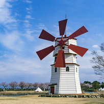 風車をバックにスタッフが自転車と一緒に写真撮影します。