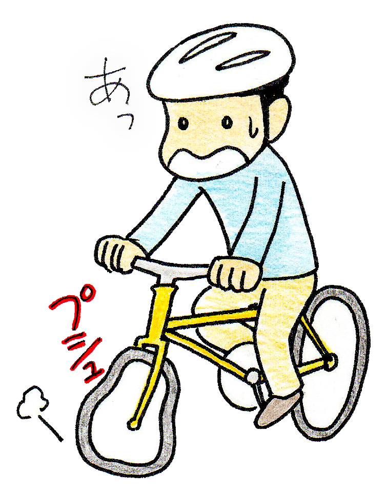 指で押してほんの少しへこむかへこまないかくらいが適切です。 (空気が少ないとペダルが重くなり、パンクもしやすくなります)。